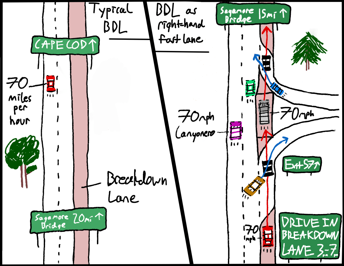 Travel in the right-hand breakdown lane is for some reason permitted on Massachusetts Route 3 between Boston and Cape Cod between the weekday hours of 3pm and 7pm. Earlier today, I happened to be driving through this portion of the route just as the appointed hour struck, and I bore immediate witness to the tragedy … Continue reading Travel in the breakdown lane